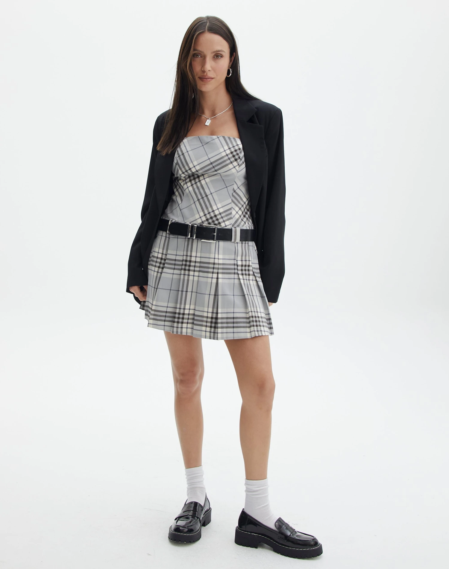 Be the first to review “Strapless Pleated Check Mini Dress” Cancel reply